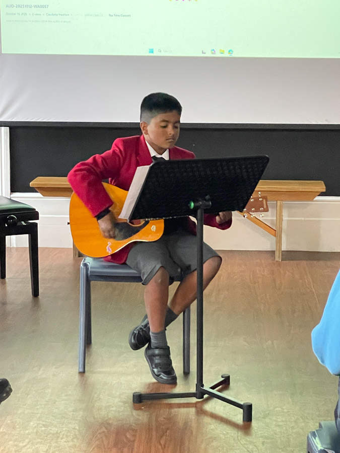 Celebrating Music at Tea Time Concert 7th November 2025 Creative Arts Performing Arts We enjoyed our first Tea Time Concert of the Autumn Term just before the break. Pupils and staff came together to celebrate performances from our talented Year 4–6 musicians. Our young musicians showcased a wonderful range of instrumental and vocal pieces, including piano, guitar, harp, cello, and singing. Well done to all our performers!