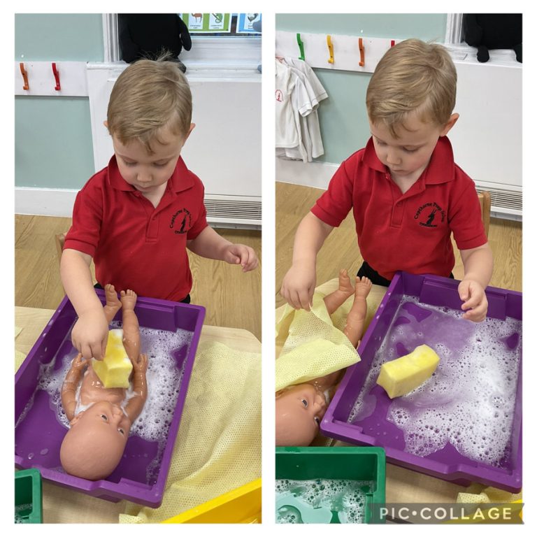 ‘Five Minutes Peace’ 10th October 2025 Nursery This week in Bumblebees preschool class we have been learning about the book ‘Five Minutes Peace’. We have been talking about how sometimes it’s nice to have some quiet time and relax. The task today was to bath the babies because we all find a bath very relaxing just like ‘Mrs Large’ in the story.
