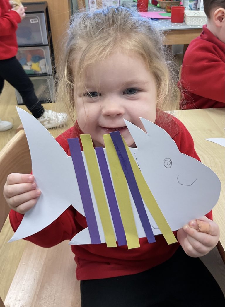 Patterns in Smiley Shark 9th January 2026 Nursery In Bumblebees pre-school class this week, we have been focusing on repeating patterns as part of our ‘White Rose Maths’ lessons, In our chosen book of the week, ‘Smiley Shark’, the character befriends an angelfish with a patterned body. We replicated this by creating striped patterns on fish-shaped cutouts.