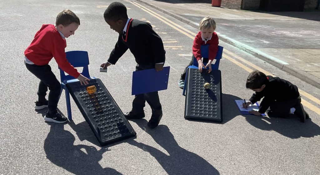 Reception Explore 3D Shapes 27th March 2026 Academic Pre-prep Reception have been exploring 3d shapes this week and as part of outdoor maths day we decided to test different 3d shapes. We had to work with a partner and investigate which shapes were able to stack, roll or slide. We had a wonderful discussion working out if certain shapes were sliding or just rolling.