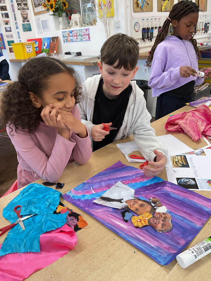 Storytelling Self Portraits in Year 4 6th March 2026 Creative Arts This term, Year 4 have been exploring how portraits can communicate the stories behind the people they represent. After studying the vibrant, narrative‑driven work of artist Venessa Scott, the children were inspired to create their own meaningful mixed‑media self‑portraits. Pupils began by gathering images of people, places and activities that hold personal significance. They then painted expressive backgrounds using their favourite colours before arranging their chosen images alongside fabric pieces and other decorative materials. Each collage was carefully composed—glued, layered and designed to reflect the children’s individuality. The final results were a fantastic collection of mixed‑media artworks that beautifully capture each child’s unique sense of identity and belonging. Well done Year 4!