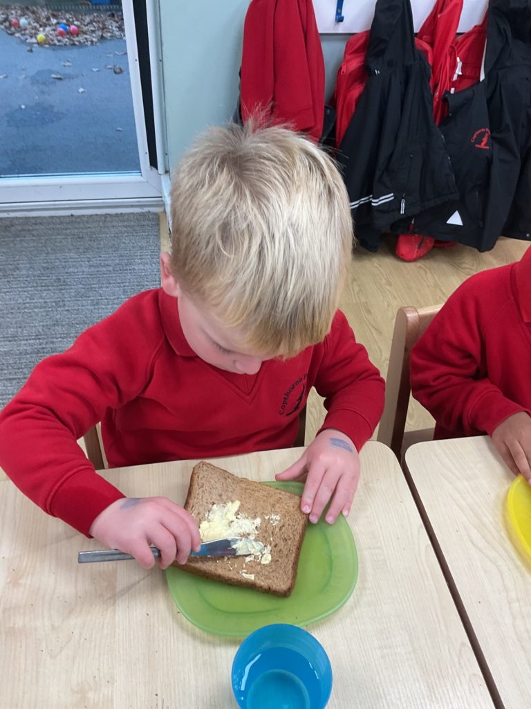 ‘Whatever Next’ 7th November 2025 Nursery Bumblebees Pre-School class has been exploring the story of ‘Whatever Next’. In the story, Baby Bear prepares a packed lunch and embarks on a journey to the moon. Additionally, we have been practising spreading butter on our own bread during snack time, as well as cutting it into rectangular and square shapes.