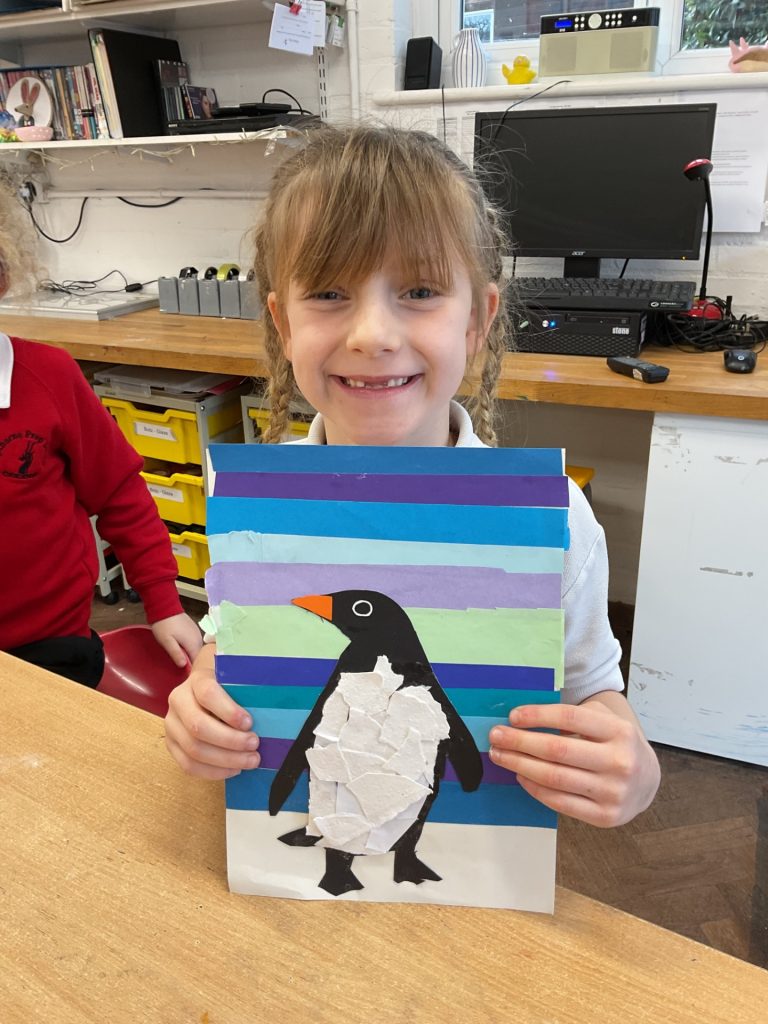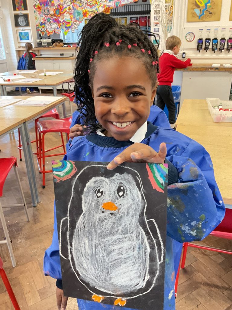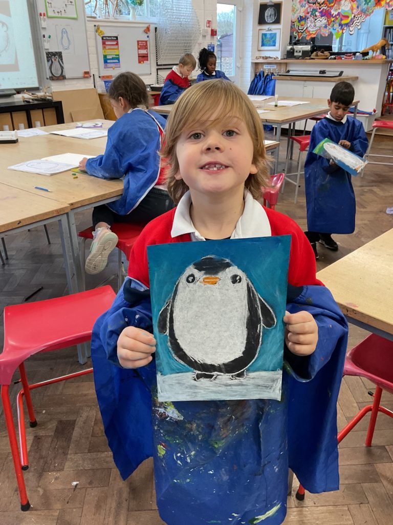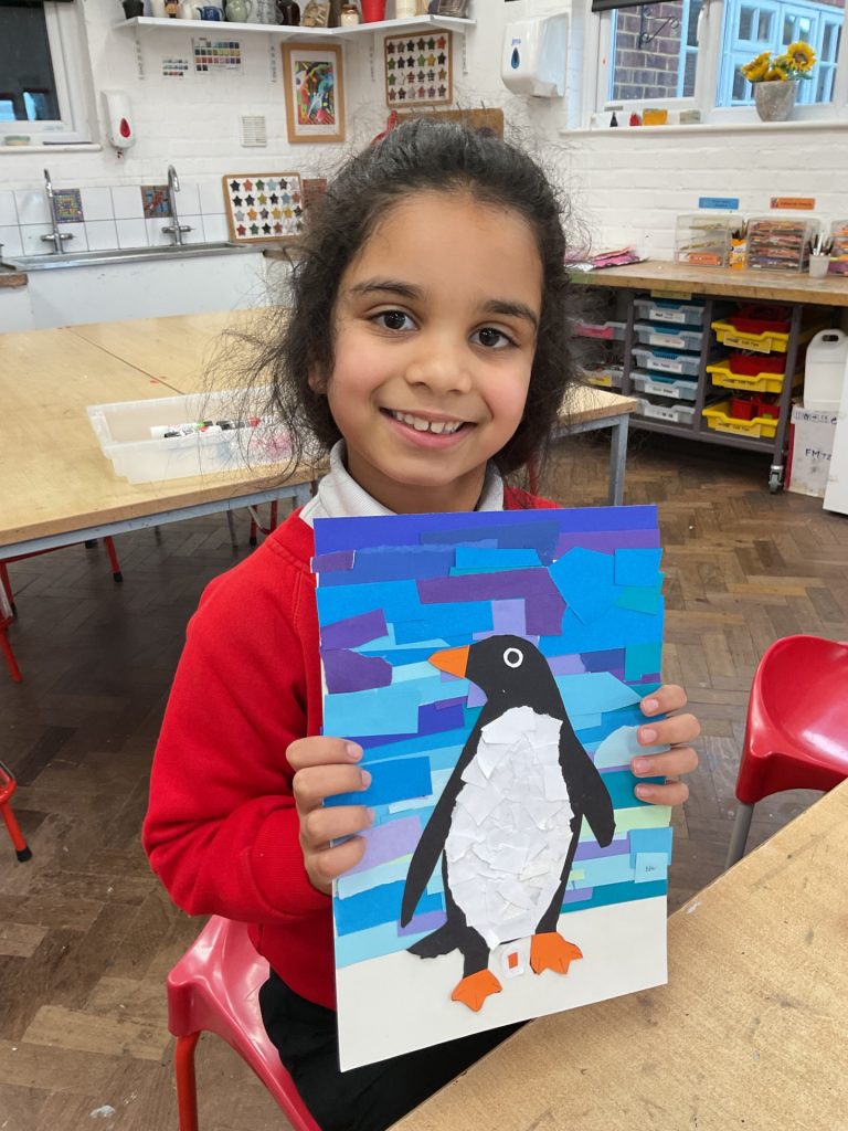 Year 2 Explore Cool Colours in Polar Themed Art 6th February 2026 Creative Arts Year 2 have been busy diving into the world of polar landscapes this term, producing a beautiful collection of artwork inspired by icy environments and Antarctic wildlife. To begin their project, the children learnt about warm and cool colours, exploring how artists use colour to create mood and atmosphere. They discovered that cool colours—such as blues, greens and purples—are ideal for representing frosty scenes and chilly climates. Using this knowledge, the children created their own polar landscape collages, carefully selecting and layering papers in cool shades to capture the look and feel of the polar regions. Next, pupils experimented with soft pastels to draw charming penguins. They thought carefully about the size, shape and position of their penguins on the page and used shading and blending techniques to bring their illustrations to life. Each penguin had its own delightful personality and character. Year 2 should be very proud of their creativity—these wintry artworks have brought a wonderful sense of polar magic to the classroom!