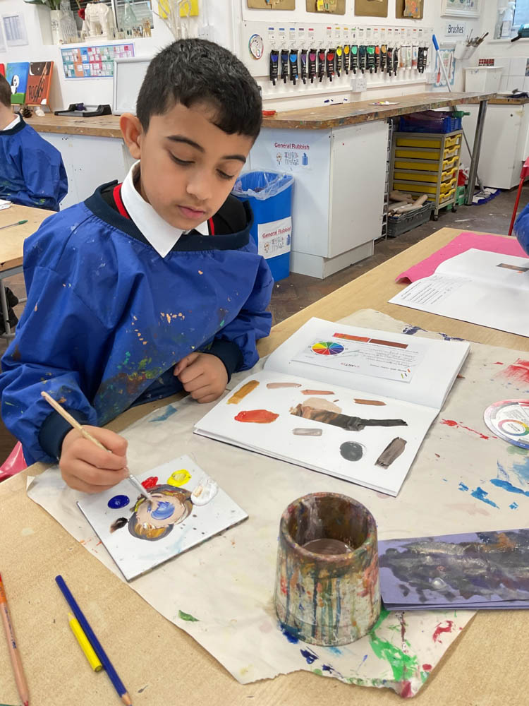 Year 4 Explore the Art of Lucian Freud 23rd January 2026 Creative Arts This week, Year 4 have been diving into the world of portrait painting through the work of celebrated artist Lucian Freud. Pupils looked closely at some of his portraits and were fascinated by the way he built up skin tones using many different variants of brown, rather than relying on just one shade. They also observed how his expressive brushstrokes helped to create depth and texture. Inspired by this, the children then had a go at being colour‑mixing experts themselves. Each pupil was given a tiny section of one of Freud’s artworks and challenged to mix their own matching variant of brown. With impressive patience and creativity, they added small amounts of different paints to adjust their colours until they were as close as possible to the original. Along the way, pupils learned new artistic vocabulary such as tint, shade, tone, and variant. They used this language confidently when explaining their colour‑mixing process to their partners. Year 4 should feel very proud of their careful observation and growing artistic knowledge. Well done, artists!